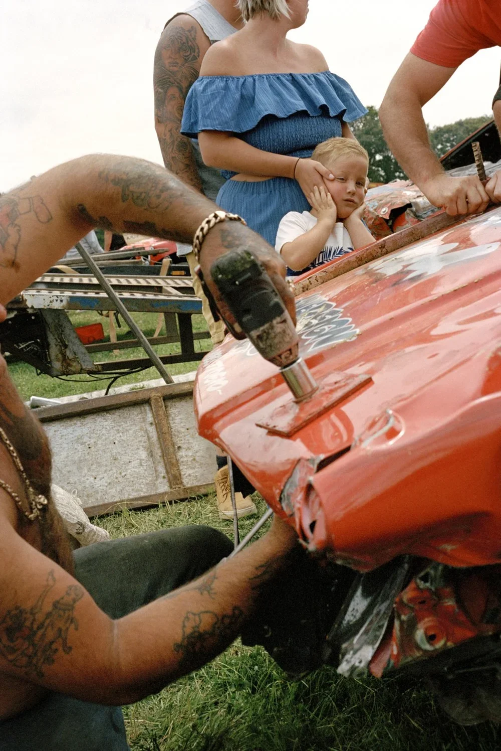 For example, my project on banger racing began in 2014. I randomly encountered a banger race at Wimbledon Stadium while I was out shooting. By chance, I found my way into the car park pits where the cars were being prepped for the race, and I started photographing the scene as a story. That project has been ongoing for eleven years where I have been returning to banger races and travelling around the UK to document the community, marking my first long-term documentary body of work.